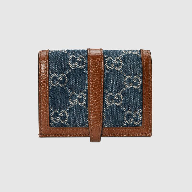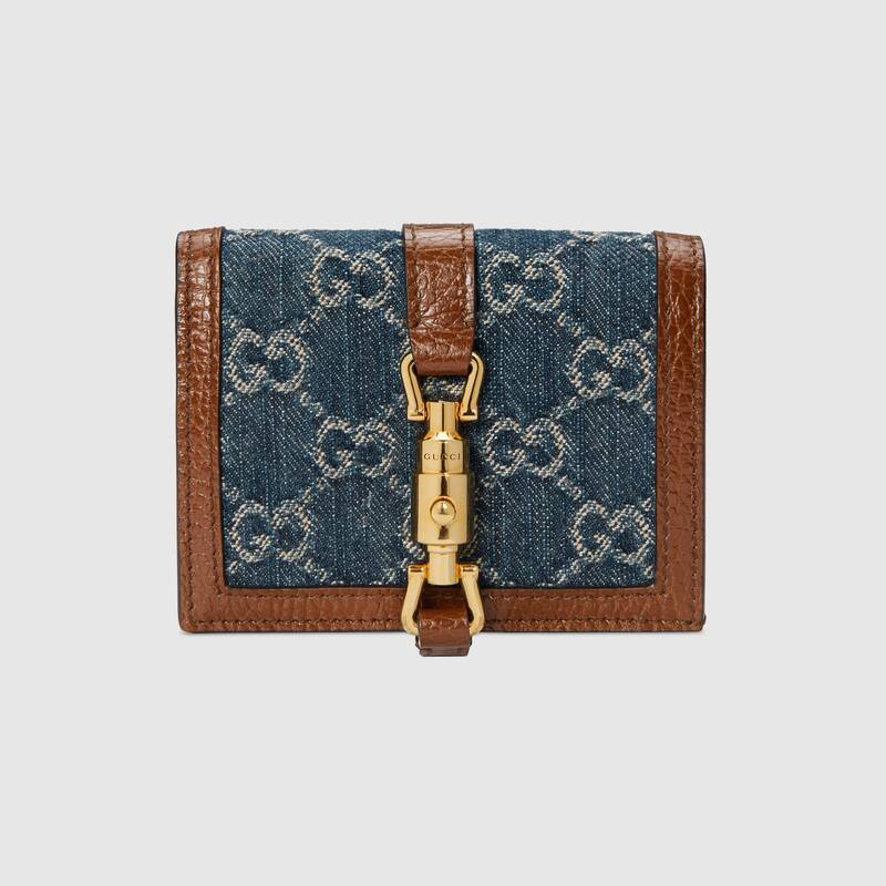 〔ジャッキー 1961〕ラインにミニサイズのカードケース ウォレットが登場。ハンドバッグに着想を得たデザインをエコ ウォッシュド GGジャカードデニムで仕立てました。ゴールドトーンのピストン ディテールは、1961年に誕生したオリジナルの〔ジャッキー〕バッグへのオマージュです。