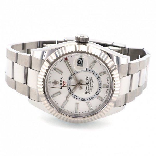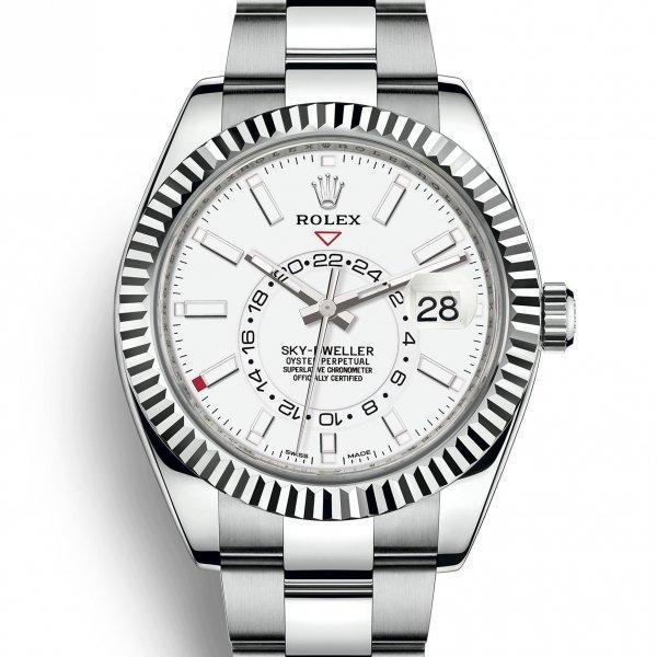 ホワイトロレゾールのオイスター パーペチュアル スカイドゥエラーは、ホワイトダイアルとオイスターストラップを備えた時計で、ダイアル上のオフセンターに配置したディスクで第2タイムゾーンを表示する。