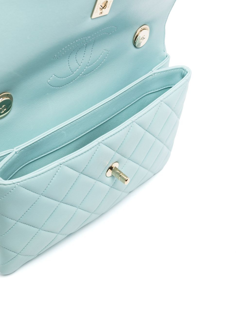 ライトブルー、ラムスキン、ダイヤモンドキルティング、ゴールドトーンのロゴプレート、レザー&チェーンストラップ、フロントにフラップ式開閉、ココマーク ターンロック式開閉、メインコンパートメント、内側にココマーク、バックにスリップポケット、ゴールドトーンの金具。正規品の印付き。こちらの商品には、Chanelのギャランティーカードが付属します。専用のダストバッグが付属しています。【コンディション:非常に良好】こちらの商品は目立った使用感やダメージがなく、新品に近い状態です。エシカルコンシャス:新しい資源を用いないプレオウンド商品のご購入が、環境問題への取り組みに繋がります。