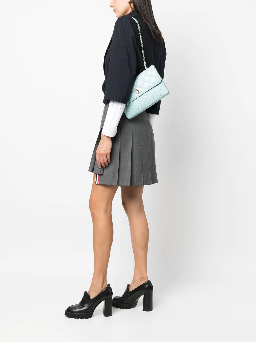 コーディネートに使用したアイテム: Thom Browne ドロップバック ミニ プリーツスカート スーパー120'Sツイル. Off-White オフホワイト ロゴ シャツ. ATP Atelier Cardona 110mm ローファー