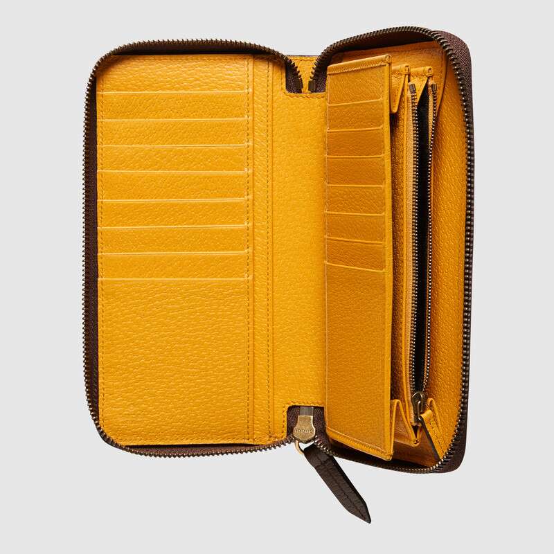 ヴィンテージにインスピレーションを得たGGスプリーム キャンバスのレザーアクセサリー。ひときわ印象的なオーバル レザー タグには、アレッサンドロ・ミケーレのエキセントリックな感覚から生まれ、今やグッチのコードのひとつとなったメタル キャットヘッドがあしらわれています。ジップアラウンドカードケースの内側は、イエロー レザーが彩ります。
